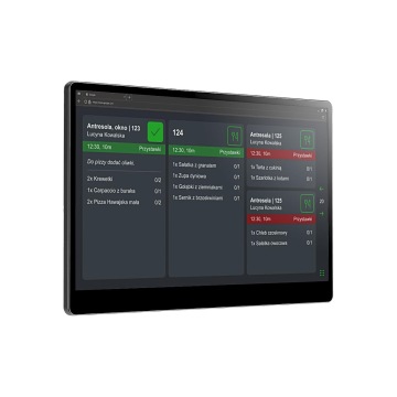 Ekran kuchenny wyświetla listę zamówień oraz informuje o czasie ich realizacji. Dania mogą być wydawane pojedynczo lub jako całe zamówienie.