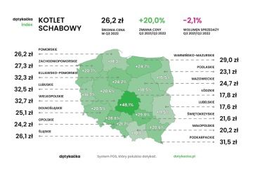 - Analiza zebranych przez nas danych przyniosła niekiedy zaskakujące rezultaty. Spodziewaliśmy się, że średni wzrost cen w stosunku do tych sprzed roku jest wyższy niż oficjalne wskaźniki inflacji, jednak wzrosty cen hamburgerów o ponad 57% w Kujawsko-pomorskiem, kotletów o ponad 48% w Łódzkiem lub zup o ponad 51% w Podlaskiem były sporym zaskoczeniem — mówi Jerzy Łochowski, Country Manager w Dotykačka. - Bardzo ciekawa jest także rozpiętość cen i ich wzrostów. Średnia cena dużej pizzy w Lubuskiem wynosiła 27,5 zł, przy wzroście o zaledwie 1%, podczas gdy w sąsiednich województwach jej cena była wyższa o 5 zł i wzrosła o ponad 18%.