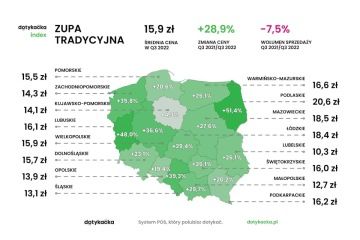 Dotykačka — dostawca niezawodnego systemu POS dla małych i średnich firm — przedstawia Dotykačka Index za trzeci kwartał 2022 r. Analitycy firmy prześledzili ceny najpopularniejszych w Polsce dań — hamburgera, pizzy, kotleta schabowego oraz tradycyjnej zupy — ich dynamikę w zależności od regionu, wolumen sprzedaży oraz zmianę w stosunku do poziomów sprzed roku. W efekcie powstał indeks cen, obrazujący trendy kulinarne nie tylko w skali całego kraju, ale także w każdym z 16 województw.
