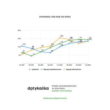W grudniu 2021 roku średnie ceny jedzenia w lokalach gastronomicznych wzrosły o 11%, w porównaniu z cenami sprzed roku. W przypadku napojów bezalkoholowych wzrost wyniósł wówczas 13%, a ceny napojów alkoholowych wzrosły nawet o 18%. Już miesiąc później ceny zaczęły się wspinać coraz wyżej, by na przełomie maja i czerwca 2022 roku osiągnąć — w porównaniu do cen sprzed roku — poziom wzrostów 19-20% w przypadku jedzenia, 17-18% w przypadku napojów bezalkoholowych oraz 16-17% w przypadku napojów alkoholowych. Od połowy 2022 roku dynamika wzrostów cen — liczonych rok do roku — utrzymuje się na stałym poziomie i nie widać znaczących zmian trendów.